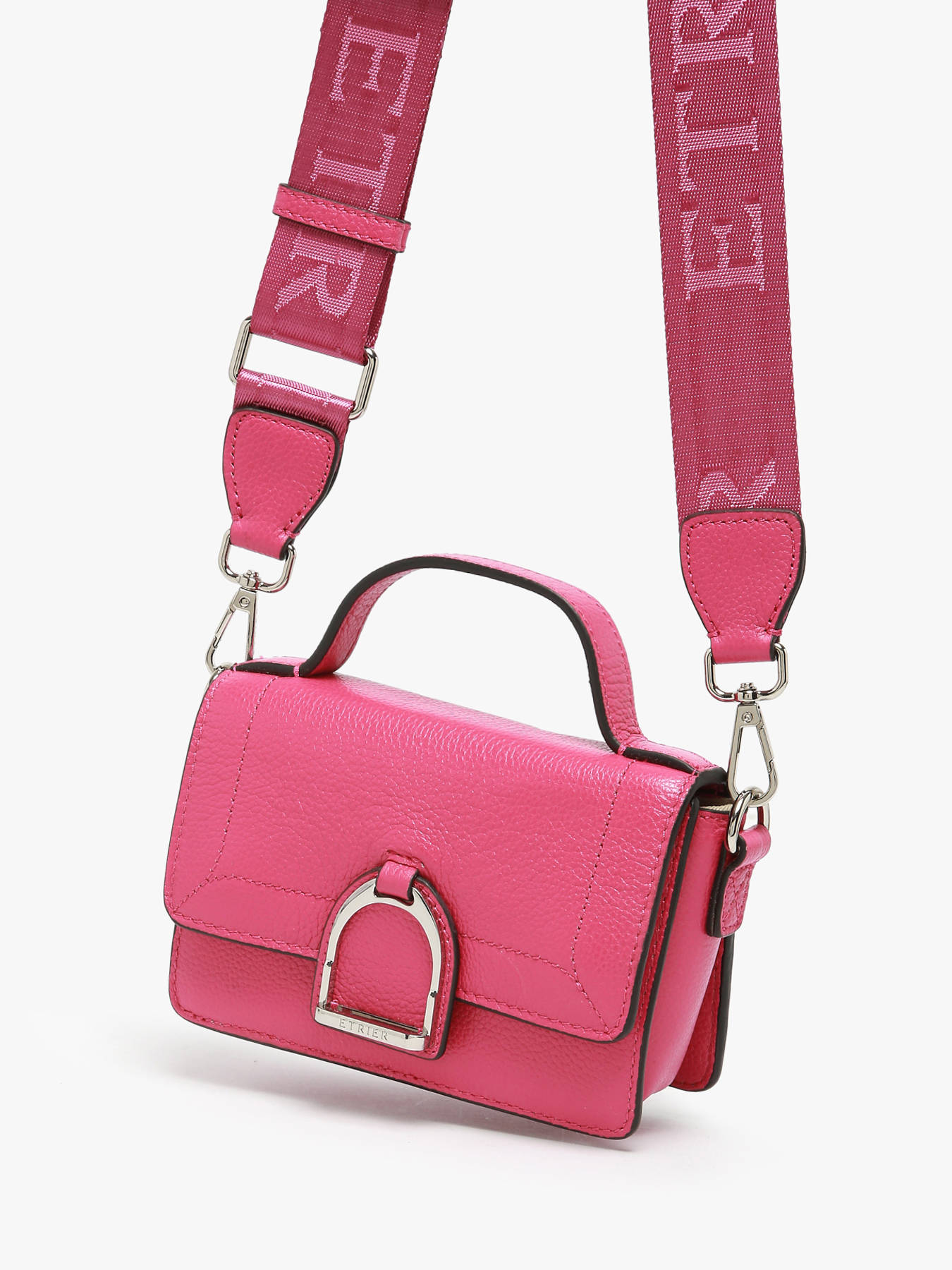 Le sac bandoulière ETRIER de la ligne ALTESSE se décline dans un mini format. Fabriqué en cuir de vachette pleine fleur, il offre une poche à l'arrière et une large bandoulière amovible en toile brodée du logo ETRIER ton sur ton, ainsi qu'une anse en cuir. Sa fermeture à rabat, ornée de l'étrier en métal emblématique de la maison, se sécurise par pression aimantée. Polyvalent, il peut être porté en bandoulière ou à la main. À l'intérieur, un porte-clé en cuir accompagne un compartiment comportant une poche plate et une poche éclair pour une organisation optimale. Il est décliné dans plusieurs coloris saisonniers, ainsi que dans deux tailles supérieures.